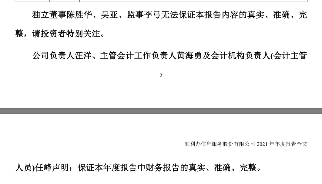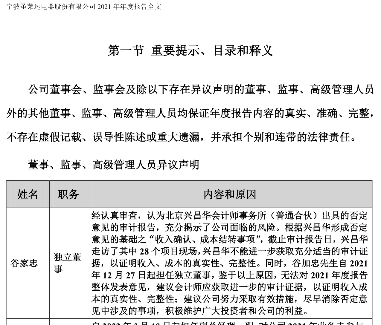 “否定意见”的只有*ST圣莱(002473.SZ)一家,其年报显示独立董事谷家忠发布了异议声明,同样是“不保真”。
