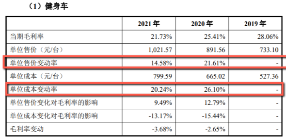 除此以外,力玄运动单位成本的变动率大于单位售价的变动率是另外一个因素。以健身车为例,2019-2021年,健身车的单位售价分别为733.1元/台、891.56元/台及1021.57元/台,同比增长分别为21.61%、14.58%。在成本端,这三年的变动幅度为26.1%、20.24%超过单位售价的变动幅度,材料采购价格上涨与产品价格调价存在一定的滞后性是主要原因,因此对近几年整体毛利率产生负向影响。