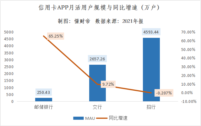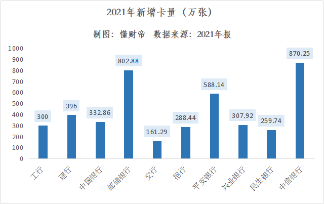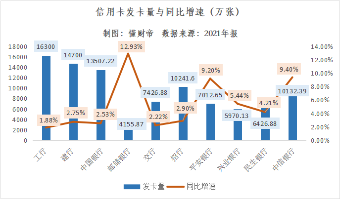 邮储银行并未披露详细的数据,而是在财报中表示信用卡业务收入同比增长了21.22%,与其整体表现相对应。