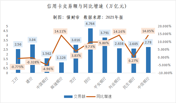 邮储银行、交行则实现了正增长,信用卡交易额增速分别为14.11%、3.83%,交易规模分别为1.126万亿元、3.016万亿元。
