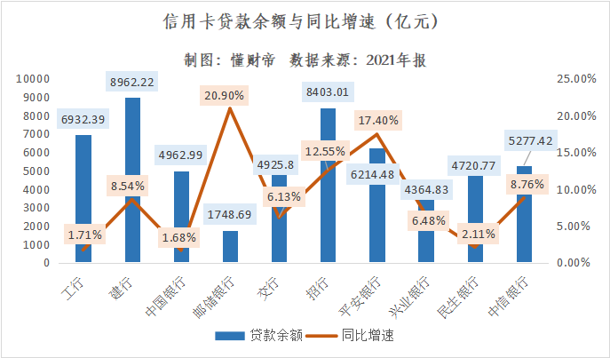 截至2021年末,建行信用卡贷款余额达到8962.22亿元,同比增长8.54%,继续位居银行业首位。
