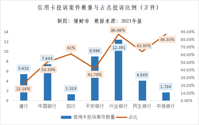 建行、民生银行信用卡投诉案件数量分别为5.432万件、4.069万件,占比分别为22.18%、63.93%。