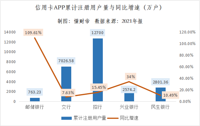 招行是绝对的王者,掌上生活APP累计注册用户量达到1.27亿户,比信用卡流通卡量规模还多2400多万。其用户增速也较为亮眼,达到15.45%。