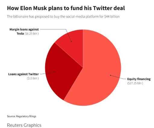 路透社这张图表明了马斯克将如何为推特收购融资: