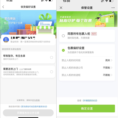 (图为用户端菜鸟和丰巢收货偏好设置页面)
