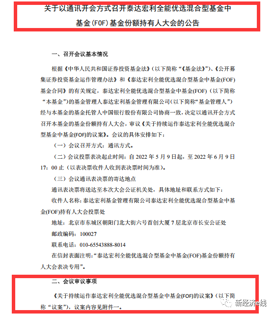 此前于5月9日,同为迷你FOF产品的泰达宏利全能优选(FOF)也公告决定召开基金份额持有人大会,提议持续运作该产品。早在去年8月16日,该基金就曾发布召开持有人大会的公告,拟对基金合同中清盘相关条款进行修订并明确提出,如持续运作、转换运作方式、与其他基金合并或者终止基金合同等,将在6个月内召集基金份额持有人大会进行表决。