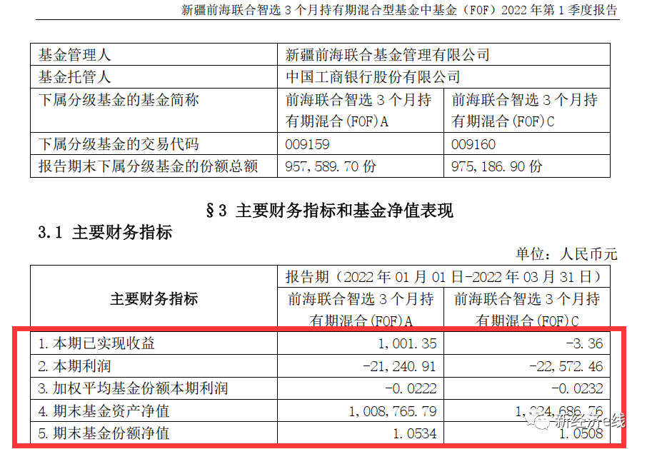 截至今年一季度末,前海联合智选3 个月(FOF)持有总份额(A/C合并)仅录得193.28万份,对应基金资产净值仅为203.35万元,是一只十足的迷你基金。早在2020年10月14日,该基金便是踩线成立,发行募集额仅2.04亿元。