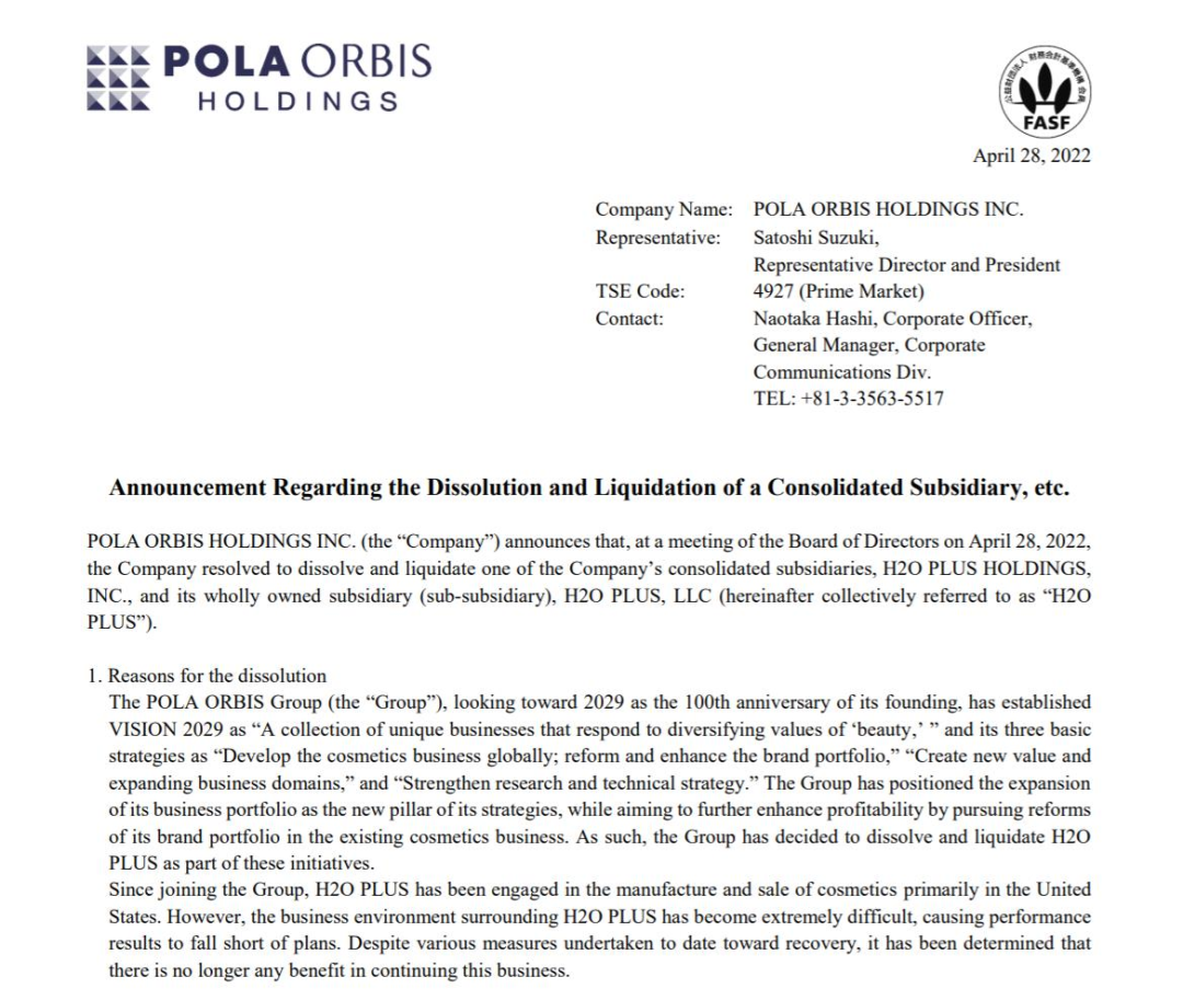 时过境迁,日前,宝丽集团(宝丽奥蜜思集团POLA ORBIS HOLDINGS,简称宝丽集团))发布“关于合并子公司等解散清算的公告”称:“由于水芝澳的业绩低于计划,虽然公司采取了恢复措施,但判断未来业务很难找到优势。因此,决定解散水芝澳公司(H2O PLUS HOLDINGS)。”