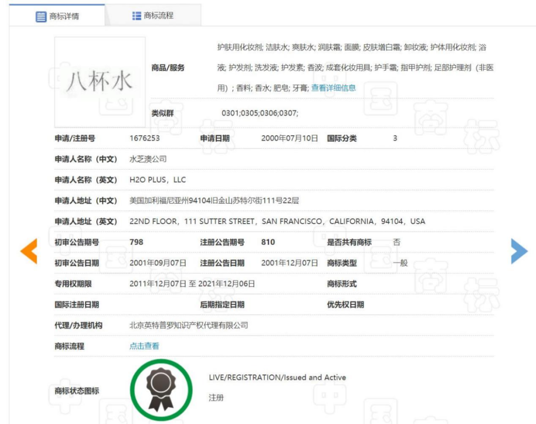 根据中国商标网显示,“八杯水”的第3类化妆品商标的所属权即为水芝澳公司,该商标的专用权期限为2011年12月7日至2021年12月6日。也就是说,该商标的专用权期限已过期。