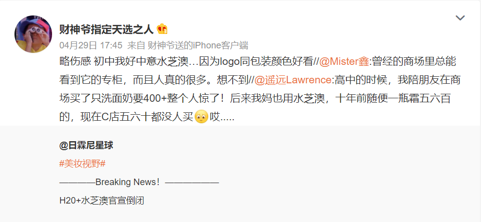 不过,作为曾经的明星品牌,面对水芝澳的倒闭,不少网友也感慨万千,“十年前随便一瓶霜五六百,现在C店五六十都没人买”“曾经的商场里总能看到它的专柜,而且人真的很多”“略伤感”。