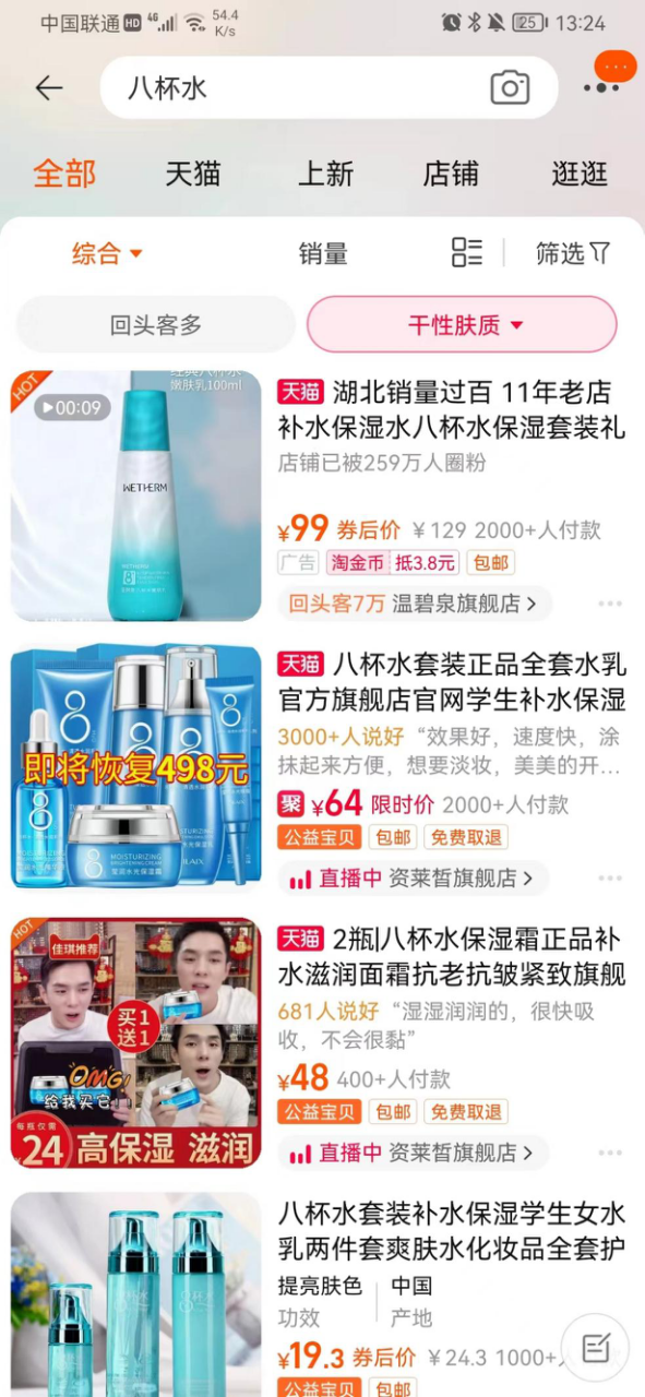 另一方面,在水芝澳凭“八杯水”一炮而红后,众多中国本土品牌也一拥而上。温碧泉、百雀羚、雅丽洁、露兰姬娜等品牌,都曾推出了“八杯水”系列产品,并对相关产品不断升级,或拓展相关产品线,且部分产品曾经的销量还比较可观。直至今日,淘宝上以“八杯水”为关键词进行搜索,依然还有不少相关产品。以上种种,都足以佐证水芝澳和“八杯水”补水概念的成功。