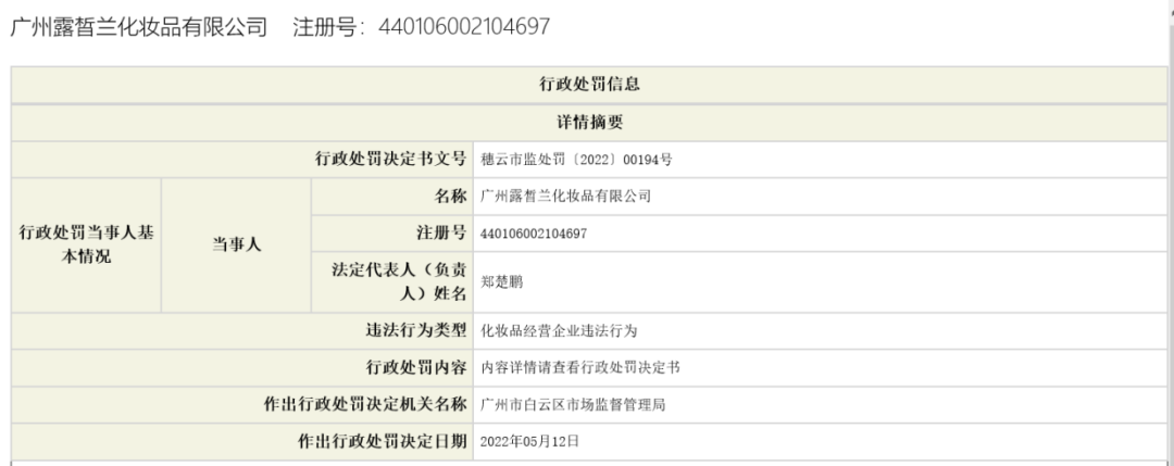 值得注意的是,国家企业信用信息公示系统显示,广州市景红达精细化工有限公司在2019年-2022年间,因化妆品违法行为被罚高达7次,并曾被广州、重庆、江西、上海等药监局多次通报。