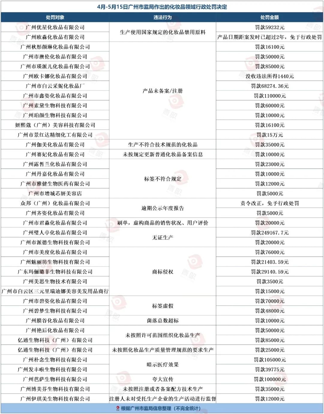 以青眼统计的4月1日-5月15日数据为例,共有38家化妆品企业在产品生产、经营过程中存在违法行为,总计被广州市监局罚款约174万,相当于每2天就有一家企业被罚。