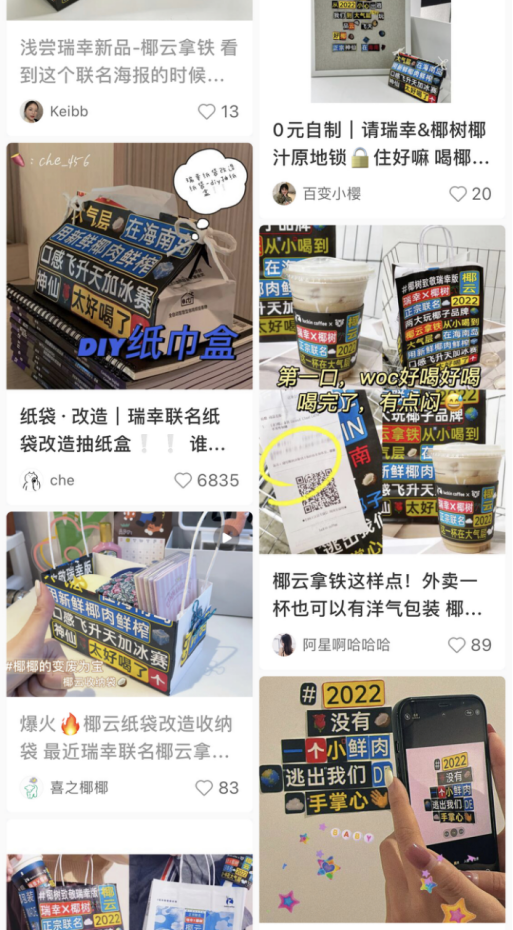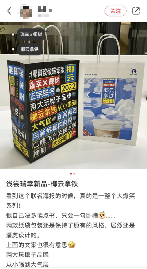 除了国外在购物袋上下足了功夫,国内也紧追其上。4月,瑞幸与椰树椰汁联名推出新品“椰云拿铁”,推出一天就卖出66万杯、一周突破495万杯。关键原因还是在于包装。