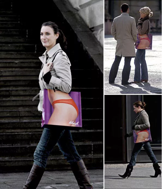 Biush的内衣广告,将购物袋与女孩的身体完美结合,美丽自信的姑娘也成为了街上的一道风景线,让人一眼就知道这个品牌所售卖的产品。
