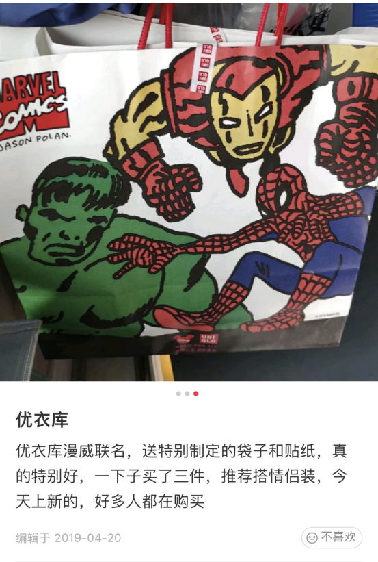 不少人是冲着购物袋去的,当时复仇者联盟4在国内掀起一波浪潮,这款联名购物袋在街上的“威力”可想而知,哪个漫威粉看见了能hold住?