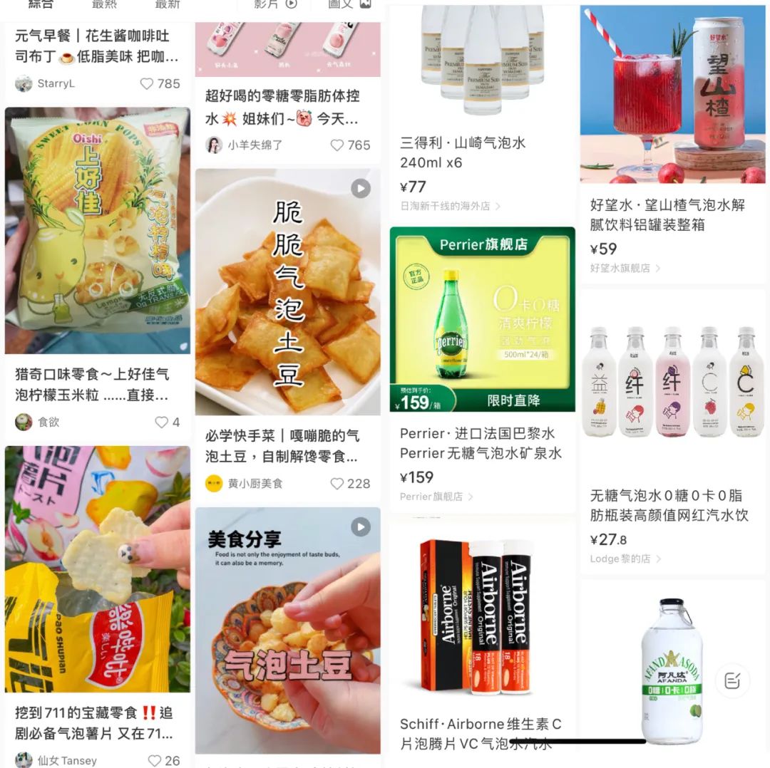 在小红书搜索“气泡水”就会发现,映入眼帘的已不再只是元气森林苏打气泡水,从果汁、茶饮、咖啡、酒饮、牛乳、凉茶、功能性饮料……你能想到的饮料里都涉足了气泡。