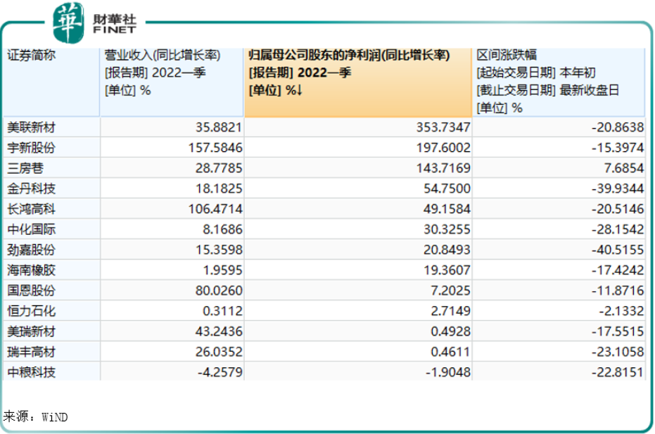 但上述公司净利润却表现不一,今年一季度归母净利润表现较为出众的分别有美联新材、宇新股份、三房巷、金丹科技、长鸿高科、中化国际等。