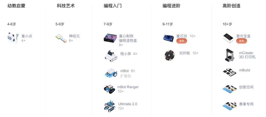 顺着这个思路,童心制物的Makeblock品牌布局了这个链条的头尾环节,作为基础设施的机器人产品和作为出口的赛事。其产品线有模块化的可编程电子积木平台「神经元」、一体化的编程教育机器人「程小奔」、针对不同学习阶段机器套件,以及配套的软件APP。赛事方面,童心制物举办了MakeX机器人挑战赛,从2016年开始入驻世界机器人大赛。