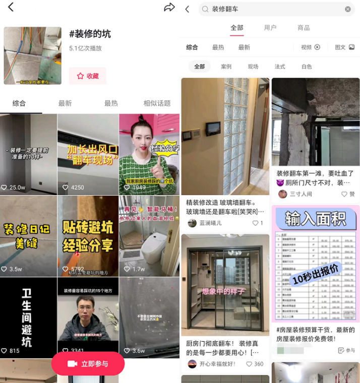 还没开始就翻了车,这在年轻人的装修中并非个例。在抖音搜索装修相关话题,可以看到#装修翻车#播放量已达5363.5万,#装修的坑#播放量更是高达5.1亿次。
