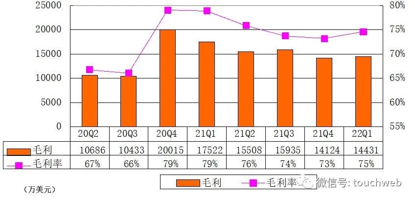 搜狐公司第一季度毛利为1.44亿美元,美国通用会计准则和非美国通用会计准则毛利率均为75%,2021年同期均为79%,上一季度均为73%。