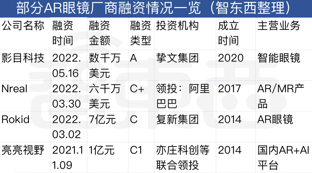 巧的是,我们仔细梳理发现,这些AR眼镜厂商都在近半年时间内获得了大额融资,深受资本青睐。5月16日,影目科技宣布已完成近千万美元A轮融资。