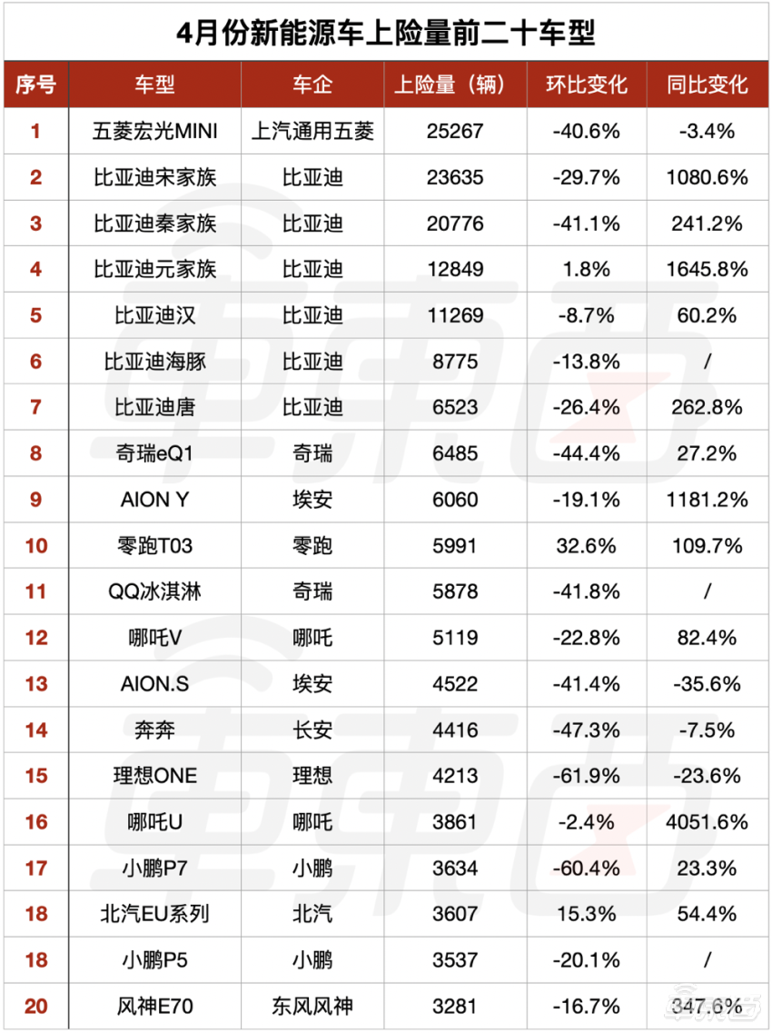 日前,国内4月份新能源汽车上险量数据新鲜出炉,为我们揭开了答案。按照国家规定,新车上路必须购买强制保险,因此上险数据就是最为真实的销量数据,反映了车市的真实销量。