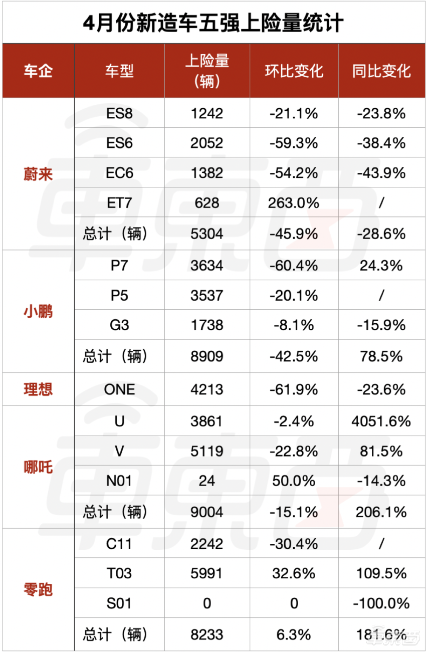 新造车方面,目前五强格局已经稳固下来了,哪吒零跑汽车都有不错的上险量数据。
