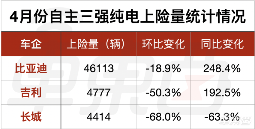 在4月这个“不跌就算赢”的环境中,比亚迪的表现显然更好。值得注意的是,比亚迪纯电动汽车的上险量为46113辆,而整体上险量则为88941辆,这也意味着,比亚迪的混动车型的上险量已经超过了4万台。DMi混动系统,正在成为比亚迪新的销量增长引擎。吉利的混动车型上险量虽然也占了一半左右,但整体市场规模显然无法和比亚迪相比。
