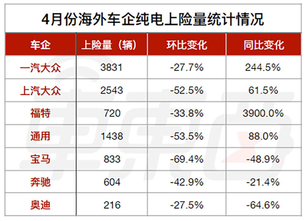 除了大众和通用之外,再无其他合资车企的纯电上险量超过1千辆,其中宝马环比下滑达到了69.4%,是所有海外车企中下滑最明显的车企。奔驰和奥迪仍然延续了此前的颓势,同比和环比都出现了不小的下滑。