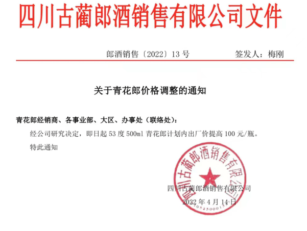 2022年4月14日,郎酒销售有限公司发布涨价通知:即日起53度500ml青花郎计划将每瓶出厂价提高100元。这意味着在提价之后,53度的青花郎出厂价由909元/瓶上涨至1009元/瓶,成为国内首家单瓶出厂价破千的酒企,同期飞天茅台、五粮液普五的平均出厂价不过969元/瓶,在价格上郎酒确实完成了“高端超越”,消费者和经销商是否买账还需要时间的检验。