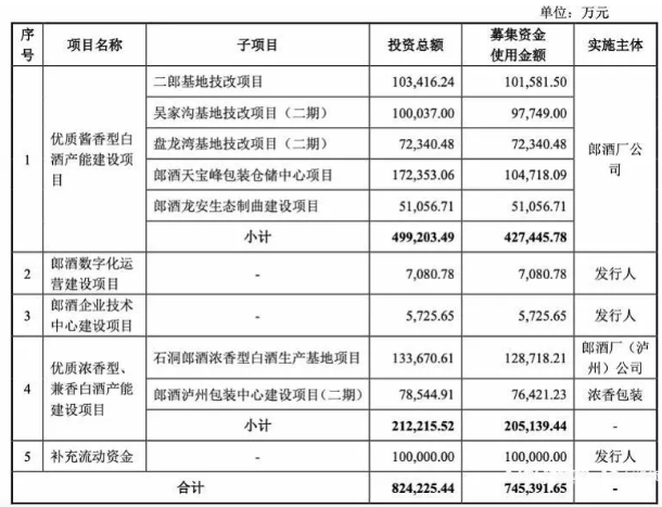 其中“优质酱香型白酒产能建设项目”、“优质浓香型、兼香白酒产能建设项目”这两个项目就需要募资63.2亿元,占IPO募资的84.8%。