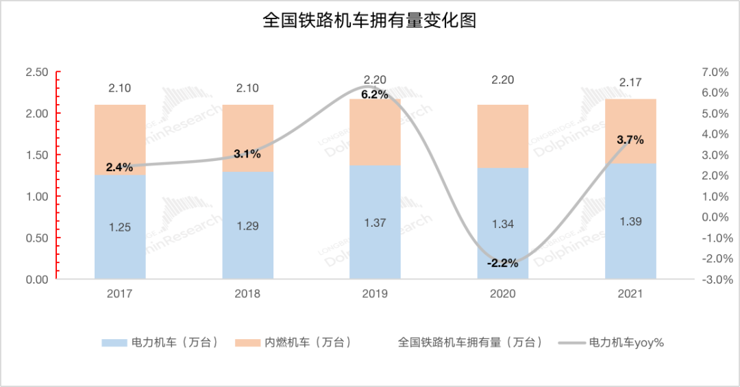 根据国家铁路局的数据,全国铁路机车拥有量保持平稳,长期稳定在2.1-2.2万台。由于铁路机车主要有内燃机车和电力机车两种,所以在内燃机车呈现减少的趋势下,电动机车拥有量近年来略有上升,2017-2021年间复合增长率2.7%,基本上仍可视为一个稳定的市场。