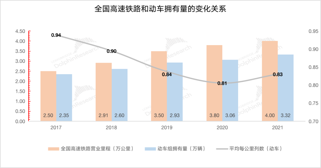 根据国家铁路局最新的数据,2021年全国高速铁路营业里程首次突破4万公里。随着高铁建设的推进,动车组的增加提升了对电气牵引系统的需求。2017-2021年间,全国高铁营业里程从公2.5万公里成长至4万公里。与此同时,动车组拥有量也从2.35万辆增长至3.32万辆。从中可以看到动车组数目与里程数的比值,在0.8-0.9的范围左右。