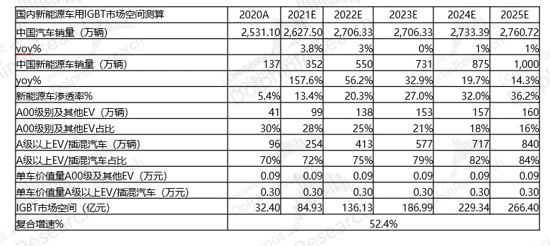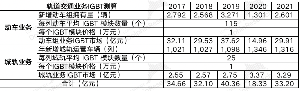 ①动车业务:根据铁路局的年度数据,除2020年疫情特殊影响外,国内新增动车组拥有量在2500-3300辆之间。结合中国铁道科学研究院对每列动车平均115个 IGBT 模块数量及1万元的IGBT模块价格来测算,国内动车组业务IGBT市场空间超30亿;