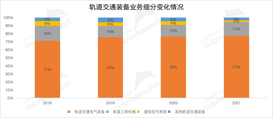轨道交通装备业务是公司“发家”的基本盘,业务变化直接影响公司最终的业绩走向。作为时代电气的传统主业,该业务包含轨道电气装备、轨道工程机械和通信信号系统等,其中最大的影响项来自于轨道交通电气设备,在业务细分中长期占有近8成。