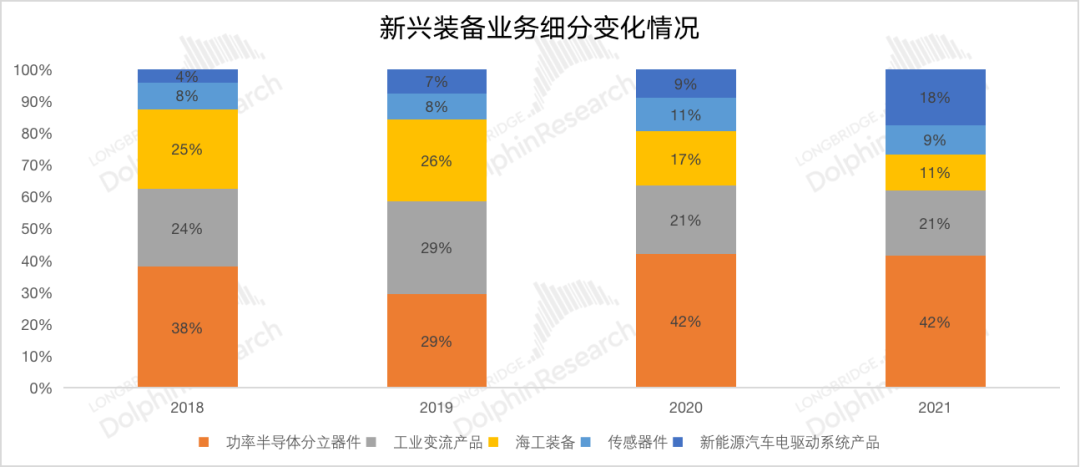 中车时代电气的新兴装备业务从2020年开始单独披露,公司也将其作为未来的发展重心。时代电气的新兴业务,主要包括功率半导体分立器件、工业变流产品、海工装备、传感器件以及新能源汽车电驱动系统。其中功率半导体已经是业务的最主要部分,占新兴装备业务的4成以上。