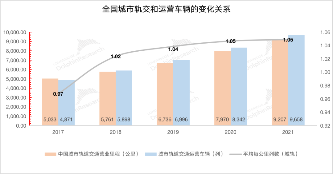 随着中国城市轨交营业里程的增长,城市轨交运营车辆数也不断增长。在2017-2021年间,从4871列增长至9658列,复合增长率18.7%。海豚君测算,运营车辆数和营业里程数的比值大约在1.05左右,高于高速铁路的车辆密度。