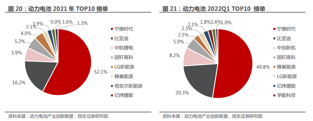 值得一提的是,宁德时代占据半壁江山,行业集中度进一步提升。根据动力电池产业创新联盟数据,2021年,TOP10企业装车量合计为142.54GWh,累计市场占比高达90.3%。
