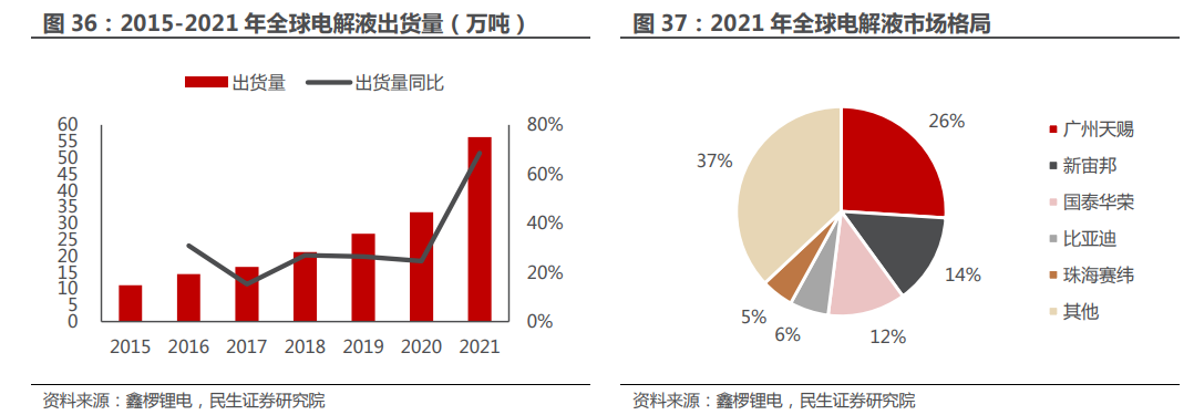 与此同时,受益于全球新能源汽车产业迅速发展,锂电池需求爆发,锂电池电解液需求激增。数据显示,2015-2021年全球电解液产量从11.08万吨增至56.8万吨,年复合增长率高达31.2%,其中2021年同比增幅达68.6%。