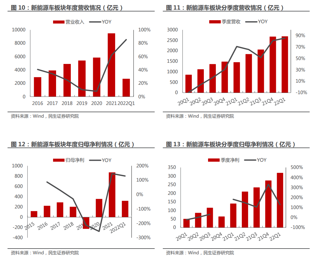 分季度来看,新能源车板块2021年全年营收逐季攀升,其中2021年第一季度、第二季度、第三季度,同比增速分别为70.79%、65.45%、51.45%,2021第四季度实现营业收入2667.44亿元,同比增速超81%。