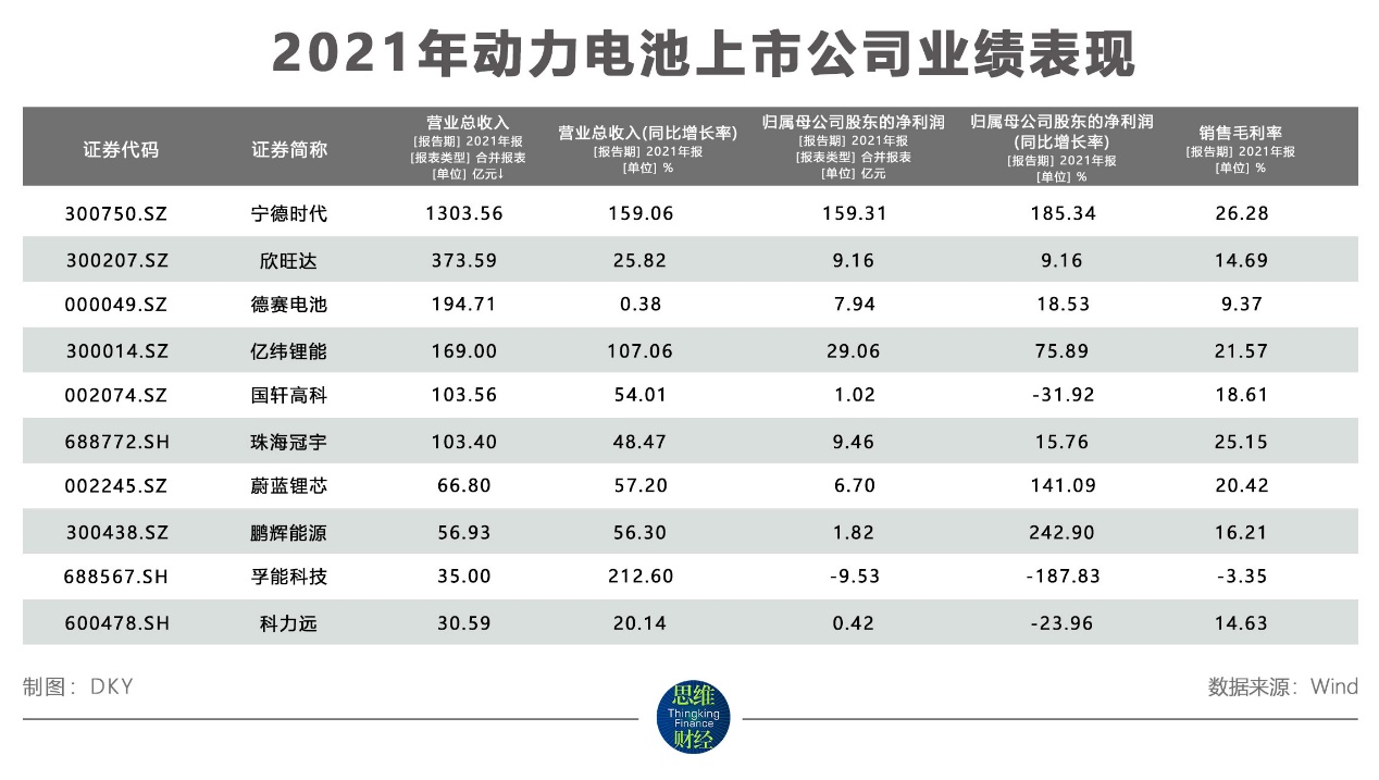 2021年,10家上市公司合计实现营收2437.13亿元,同比增长83.50%。其中宁德时代、孚能科技和亿纬锂能的营收均实现翻倍增长,2021年分别实现营收1303.56亿元、35.00亿元、169.00亿元,分别同比增长159.06%、212.60%、107.06%;从归母净利来看,2021年10家公司实现归母净利215.36亿元,同比增长121.35%。