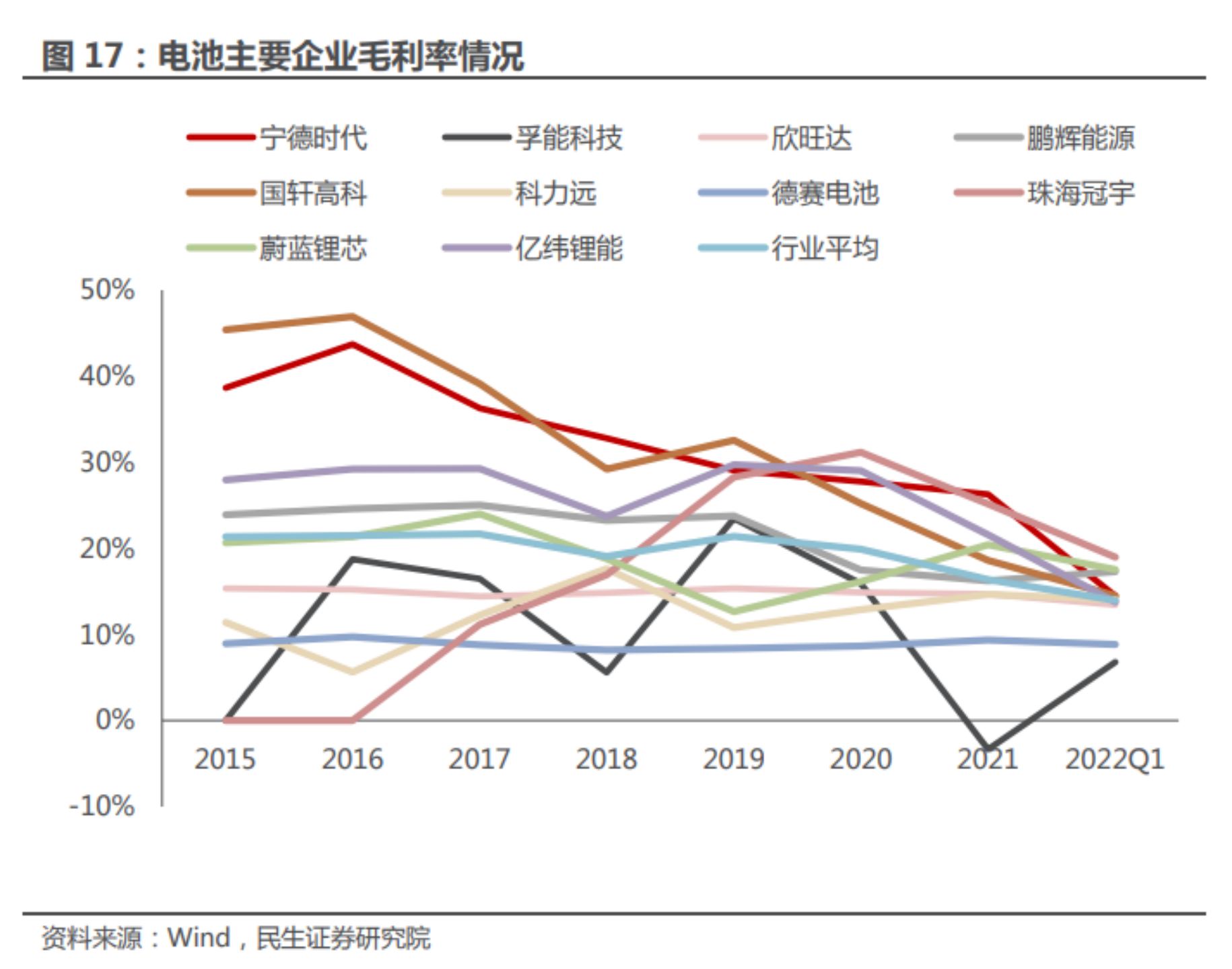 民生证券认为,动力电池上市公司的毛利率趋于平稳,自2016年开始,行业毛利率呈下滑趋势,主要原因在于价格端和成本端的双重压力。2022第一季度,受上游原材料波动影响,毛利率下滑严重,行业平均毛利率为13.97%,较2021年全年下滑2.39个百分点。