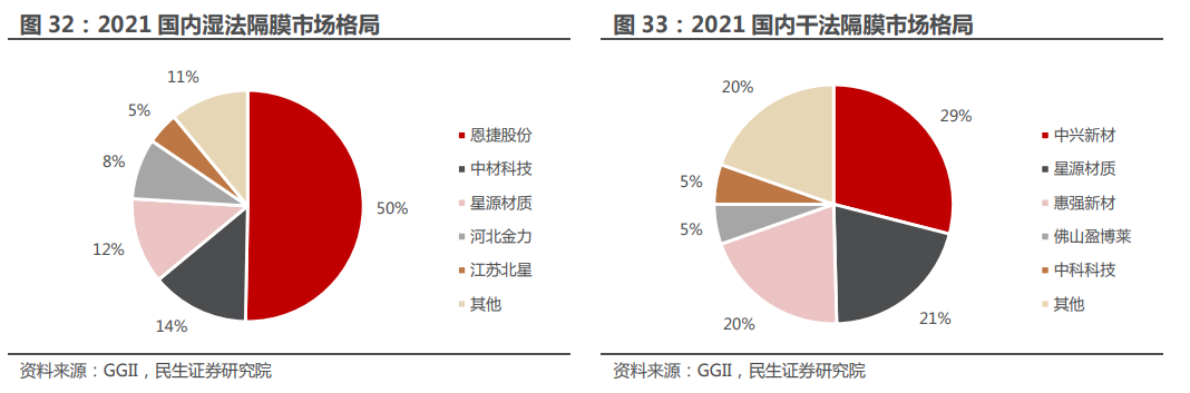 民生证券预计,未来隔膜市场份额将继续向头部企业集中,其原因为行业设备与技术壁垒过高,产线周期长,新玩家难以进入赛道。龙头企业已具备产能优势,规模效应明显,对成本控制能力强,客户粘性高,未来成长性确定。因此,二三线厂商将被逐步出清,龙头市场份额持续扩大。