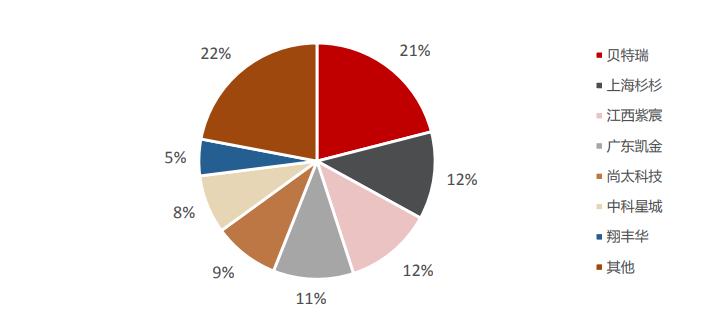 2021年,国内负极材料的主要供应商有贝特瑞、江西紫宸、杉杉科技、东莞凯金等,年度出货量均突破8万吨。其中,贝特瑞稳居国内负极龙头地位,市占率约21%,同比提升2个百分点;上海杉杉与江西紫宸并列第二,市场份额均为12%。