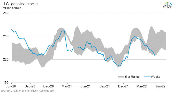 EIA数据显示,截至5月7日当周,美国汽油库存量为2.25亿桶,处于近五年低位。