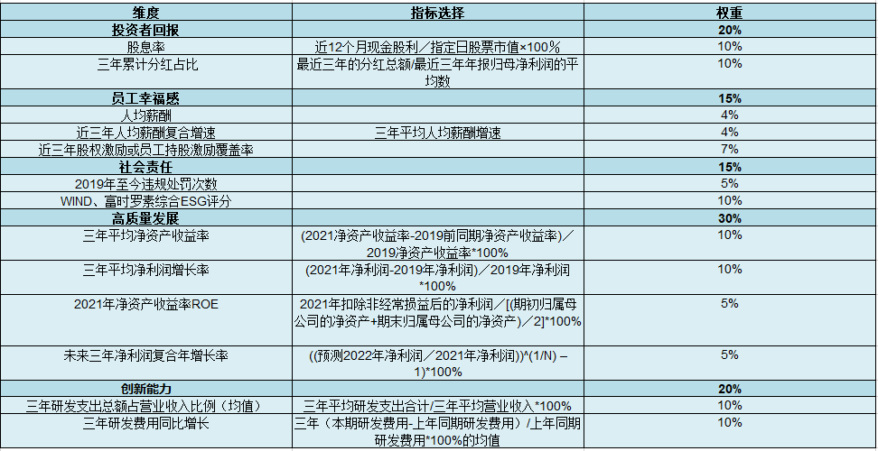 第一项投资者回报的权重占比为20%。衡量该回报率的两个指标分别是股息率以及三年累计分红比例,两项指标权重分别为10%。股息率的计算方式为近12个月上市公司公布的税前现金股利/股票市值,三年累计分红比例的计算方式为2019年至2021年分红总额/归母净利润均值。这两项指标旨在衡量上市公司作为一个投资标的,刨除二级市场的波动外,能为投资者以及股东创造多少现金收益,也就是常说的投资回报率。一部分长期不分红的“铁公鸡”,这项的评分不会很高。