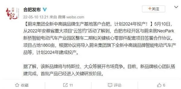 5月10日,“合肥发布”的一则消息曝光了蔚来全新品牌的动态。