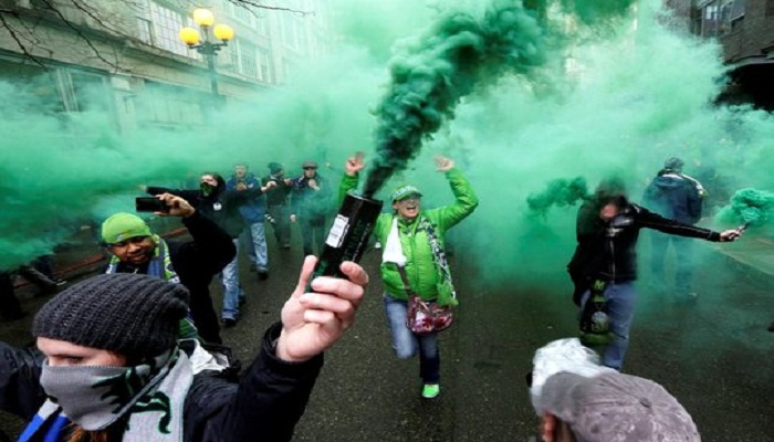 如今,“糟粕”同样出现在美国的足球赛场上。美国西部城市西雅图是一个受欧洲足球文化影响颇深的地方,这里有着美国职业足球大联盟(MLS)最高的上座人数以及一个规模庞大、球迷狂热的球迷组织——绿宝石城支持者(E.C.S)。每逢西雅图海湾队的比赛日,世界互联体育场总会挤满成千上万身着球队传统绿色球衣的球迷们。在比赛开始前半小时,体育场内的平静会被击鼓声打破,球迷们燃放绿色的焰火,为主场营造最疯狂的气氛。但与此同时,我们也会听到这样有节奏的歌声: