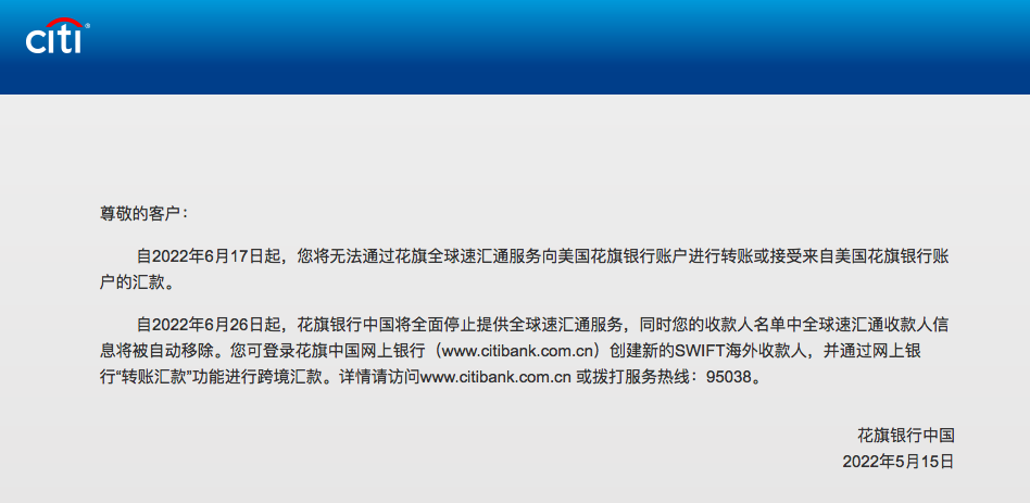 5月16日,花旗银行(中国)官网发布《关于花旗银行全球速汇通服务变更的通知》称,自2022年6月17日起,用户将无法通过花旗全球速汇通服务向美国花旗银行账户进行转账或接受来自美国花旗银行账户的汇款。